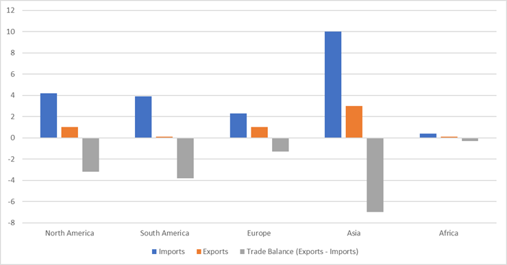 The graph shows the trade value of edible fishery products between the United States and various regions, measured in billions of dollars in 2018.
