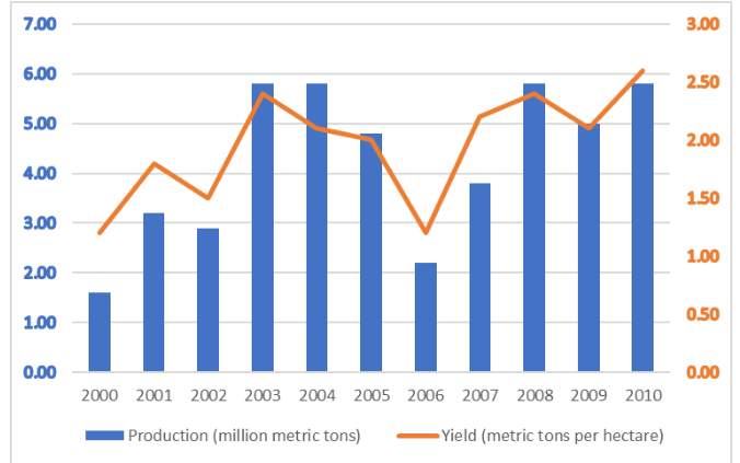 The graph above shows wheat production in million metric tons (blue bars) and yield in metric tons per hectare (orange line) for a country from 2000 through 2010.