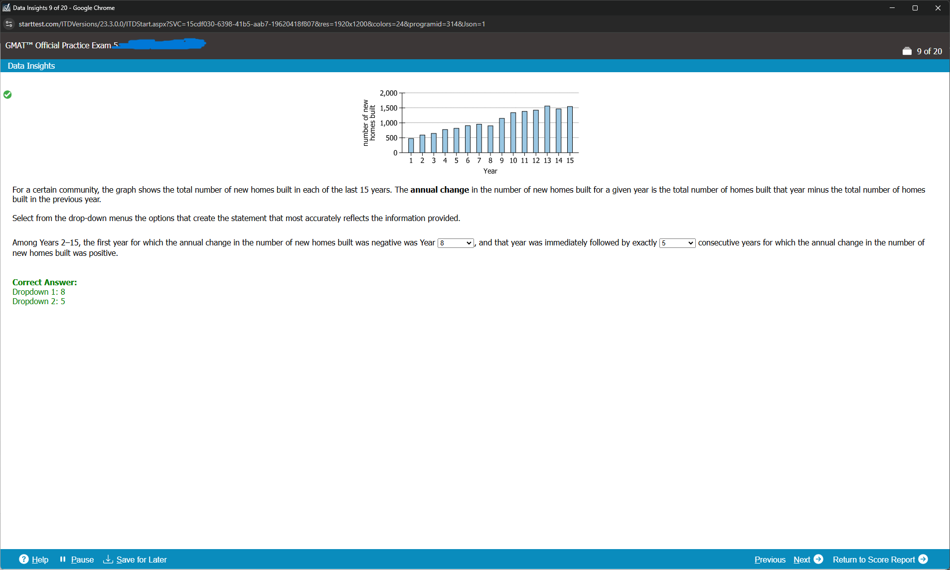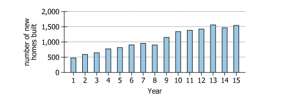 You're trying to find out the annual change that is less than the year prior. The first instance where this is shown is in year 8 where the number of new homes built is closer to 800 while in year 7, it's closer to 900. This then follows a period where year 9-13 have increases and then another decrease in year 14.