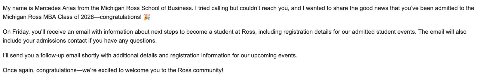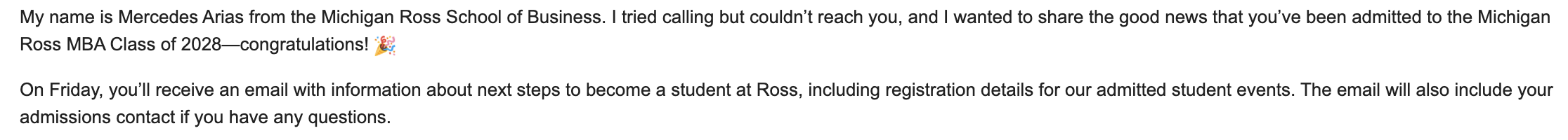 I think different ad comm members are choosing to share the news differently. Email comms seems to be the way Arias is doing it with all candidates.