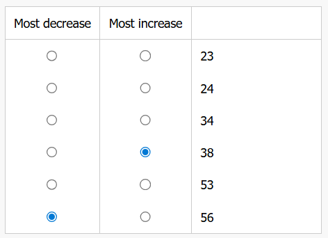 | Values | 23 | 24 | 34 | 38 | 53 | 56 | |