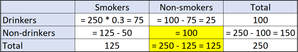 | Smokers | 30%*250=75 =.6x=.75y | .4x | x |