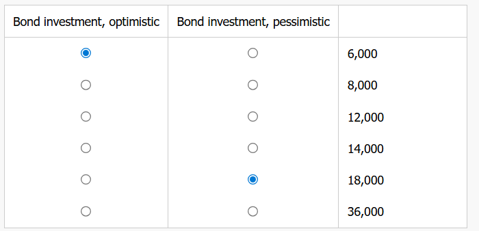 Bond investment, pessimistic the amount the investor must invest in the bond to reach the $600 goal under the pessimistic scenario. Make only two selections, one in each column.