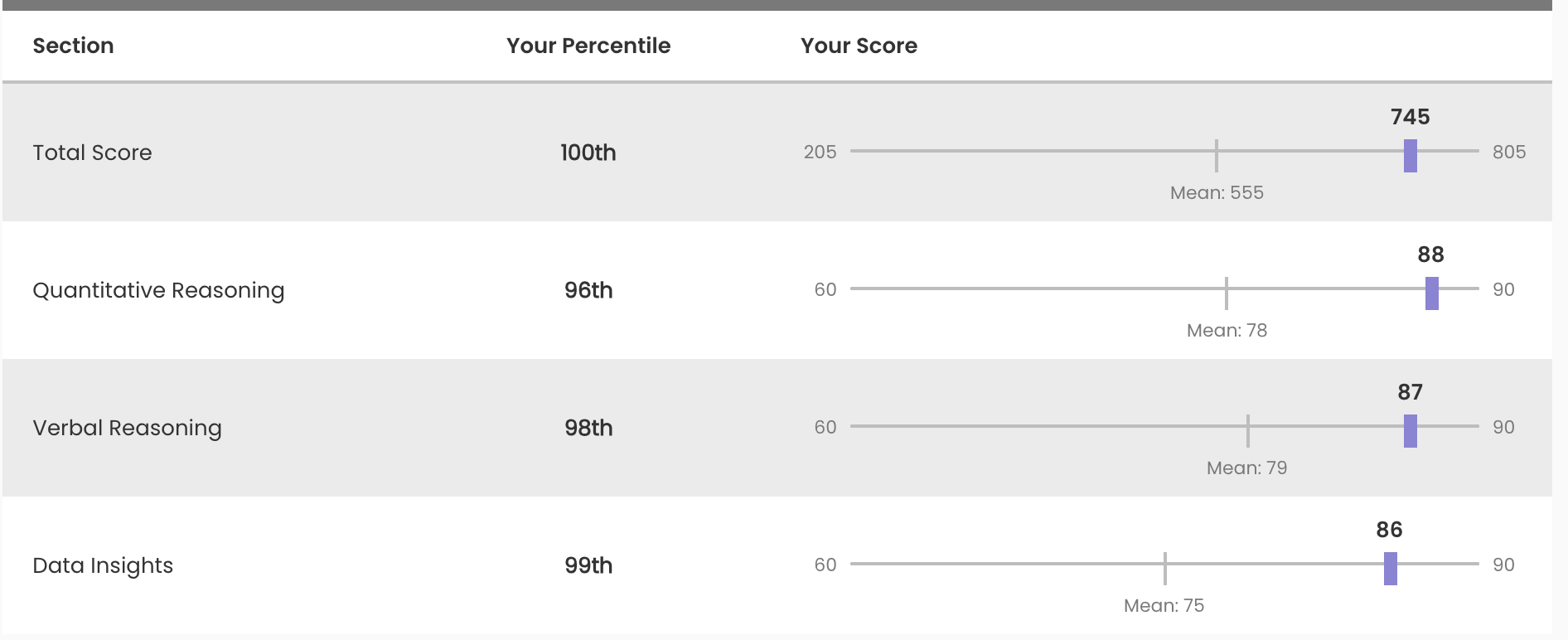 Verbal had some mistakes, but I think the "shadow" adaptive algorithm meant that I was already getting harder questions. Data insights felt fine, although the end was stressful. I was not too happy during the exam, expecting maybe a 695. But the screen at the end showed up and : 745. I could not believe my eyes, and after the instructor confirmed we are done, I burst out laughing.