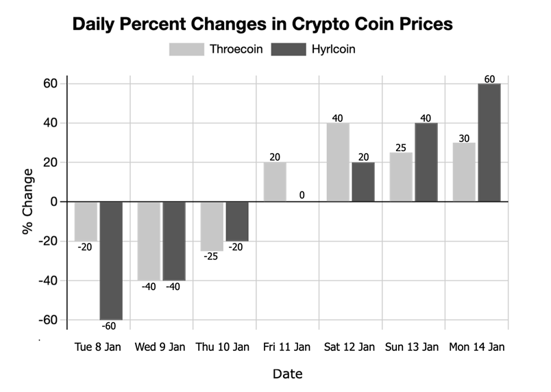 The graph shows the percent change in the price, in U.S. dollars, of each of two cryptocurrency coins—Throecoin and Hyrlcoin—from noon Fernando de Noronha Time (FNT) the previous day to noon FNT on the day marked, for dates in 2025. For instance, the price of Throecoin in U.S. dollars was 25 percent higher at noon FNT on Sunday, January 13, 2025, than it was at noon FNT on Saturday, January 12, 2025.