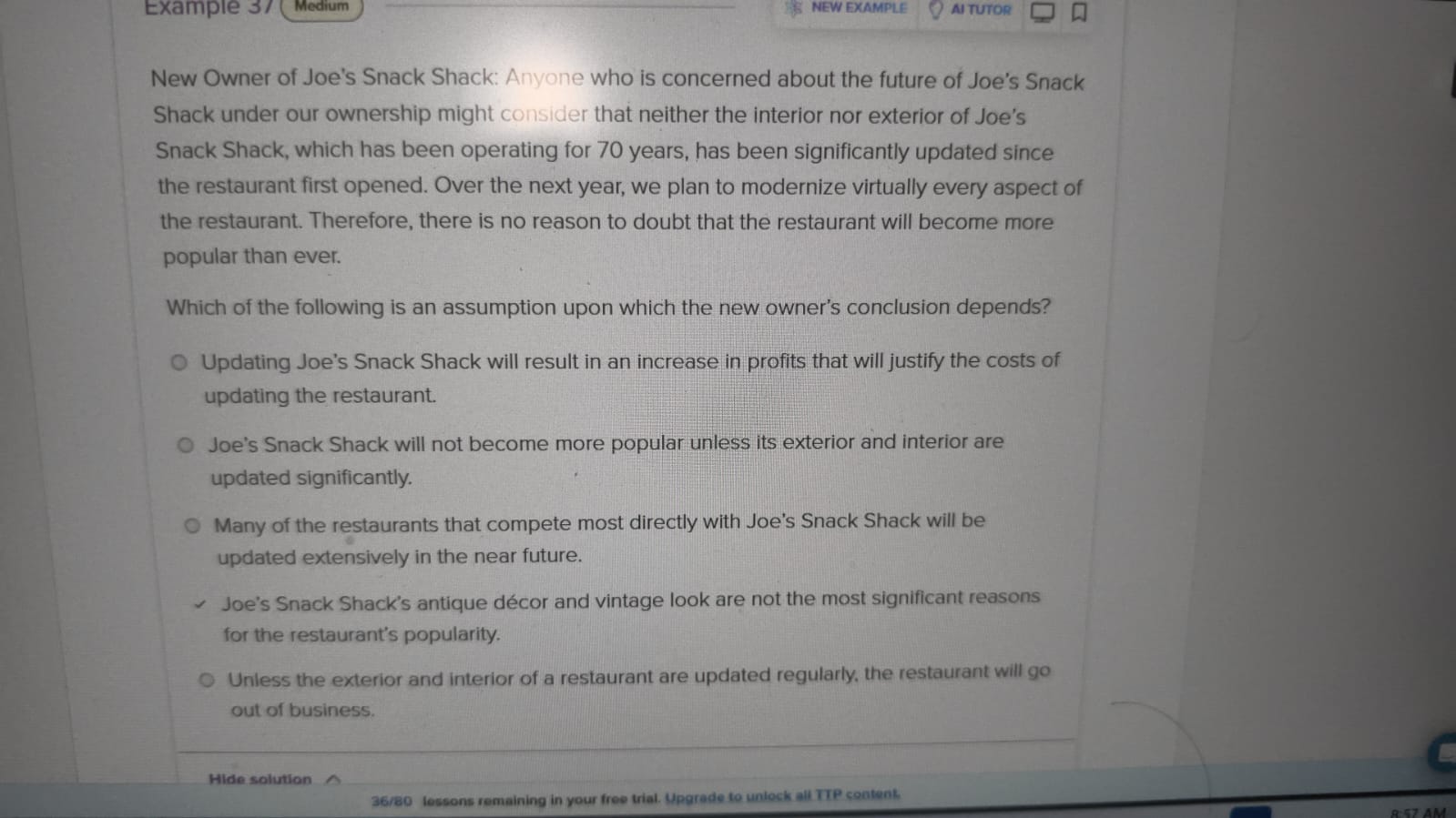 The conclusion depends on the assumption that the old, vintage appearance is not what's making it popular — otherwise, modernizing it could actually hurt its popularity. That's exactly why the marked answer is correct: if the antique décor were the reason for its popularity, updating it would undermine the owner's conclusion entirely.