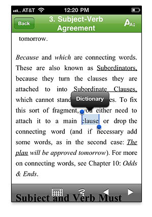 + Google Dictionary. Now available throughout the app (for iOS 3.2 and higher). Just select word and tap "Dictionary" to look up its meaning in English or translation to your native language (Internet connection required)