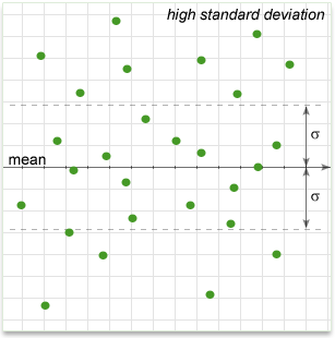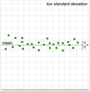 In simple terms, it shows how much variation there is from the "average" (mean). It may be thought of as the average difference from the mean of distribution, how far data points are away from the mean. A low standard deviation indicates that data points tend to be very close to the mean, whereas high standard deviation indicates that the data are spread out over a large range of values.