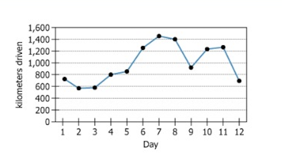 Two business partners who operate a truck have agreed that neither partner will drive the truck for more than 10 hours in any calendar day. The graph shows the number of kilometers that the truck was driven during each of 12 consecutive calendar days. On days 7, 8, 9, and 11, the driving time was equally divided between the two partners. On each of the other days, only one of the partners drove. No one else drove the truck. Everywhere the truck was driven during the period shown, the maximum speed limit was 100 kilometers per hour or less.