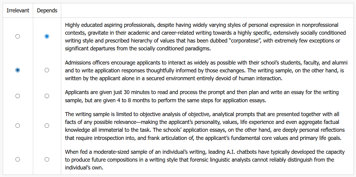 Until last year, the dominant standardized test for applicants to a certain class of professional graduate schools included a 30-minute writing sample, which which was passed on to admissions staff at each school to which the test taker eventually applied. Revisions made to this testing paradigm last year eliminated this writing sample—depriving admissions officers of a reference composition that, as a result of the test’s robust identity verification procedures, was guaranteed to have been written by the named applicant.Admissions officers at a number of these schools—increasingly concerned that applicants could enlist an artificial-intelligence (A.I.) chatbot to compose their application essays—have called for the test maker to produce a standalone version of its former writing sample, for applicants to take under the same identity verification and testing conditions as the test itself. While none of these officials certainly do not expect to catch all, or perhaps even most, applicants who attempt to outsource the creation of their application essays, they publicly maintain that the verified writing sample is an important ‘security check’—dismissing potential concerns about A.I. ghostwriting for applicants whose eventual application essays are, in a broad sense, stylistically parallel to the writing sample, while flagging for suspicion and further investigation any application essays that stylistically diverge from the named applicant’s verified writing sample in any obvious way.Below are three observations that (if true) weaken the public position of the admissions officers quoted above; one observation that neither weakens nor strengthens their position; and one observation that weakens their position IF the primary writing style of leading A.I. chatbots conforms to a certain set of generalizations, but strengthens that position otherwise. Select Irrelevant for the consideration that neither strengthens nor weakens the admissions officers’ position, and Depends for the consideration that weakens the officers’ position if A.I. chatbots’ writing styles converge on certain paradigms but that strengthens it if they do not. Make only two selections, one in each column.