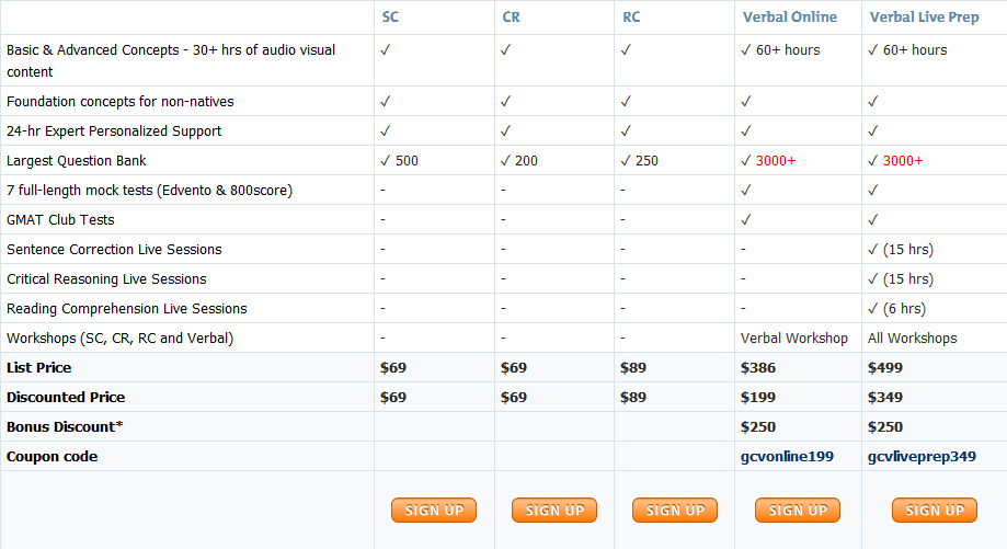 - 36 hours of live instruction: Our live sessions complement our eLearning courses and offer 36 hours of live instruction on GMAT Verbal, 2X more than most major test prep companies. The best part, we offer it at a fraction of the price. Click here