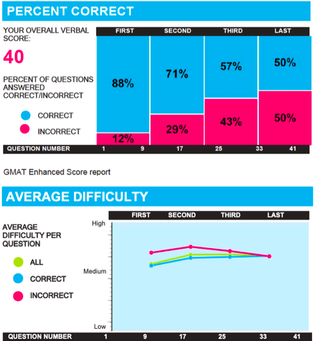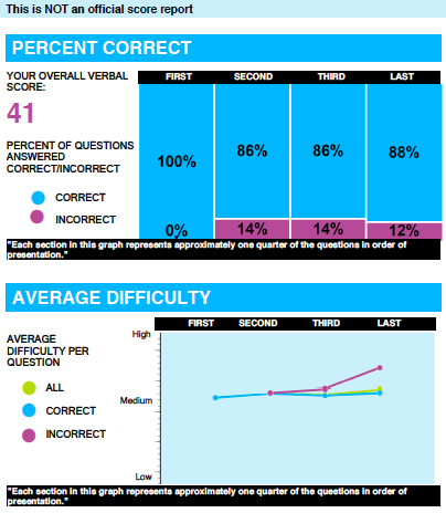 On the other extreme, we have seen scores of as low as V28 (50%) with as few as 9 questions wrong, and scores as high as V40 with as many as 10 questions wrong, so clearly, the adaptive scoring algorithm can still make a big difference on Verbal, even if the algorithm's influence isn't as obvious as it is on Quant.