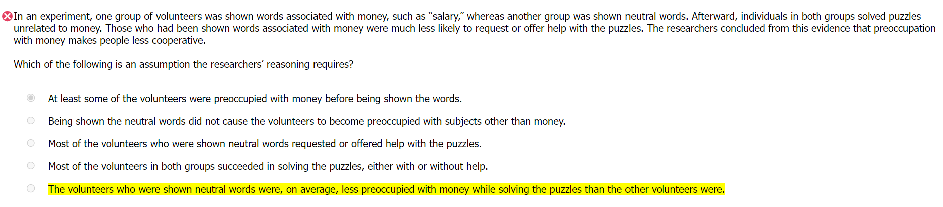 So, we can see that the researchers must have assumed what this choice says, that the volunteers who had been shown neutral words were less preoccupied with money than the others. After all, if they were not less preoccupied with money, then the evidence would not support the conclusion.