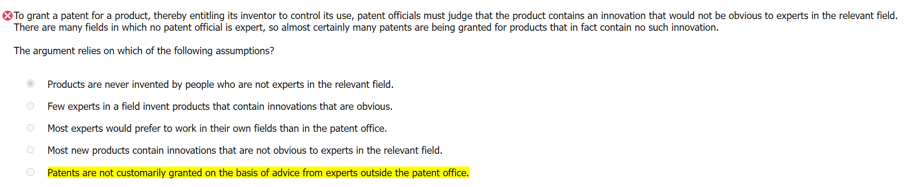 The argument relies on which of the following assumptions?The question is an Assumption question, and the correct answer will be information that's necessary for the evidence to effectively support the conclusion.