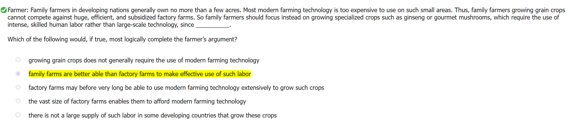 Now, this choice provides additional support for the conclusion by indicating that family farms that grow specialized crops will be able to compete with factory farms. After all, if it's true that, as this choice says, "family farms are better able than factory farms to make effective use of such labor," then family farms will have an advantage in the business of growing crops that require such labor.