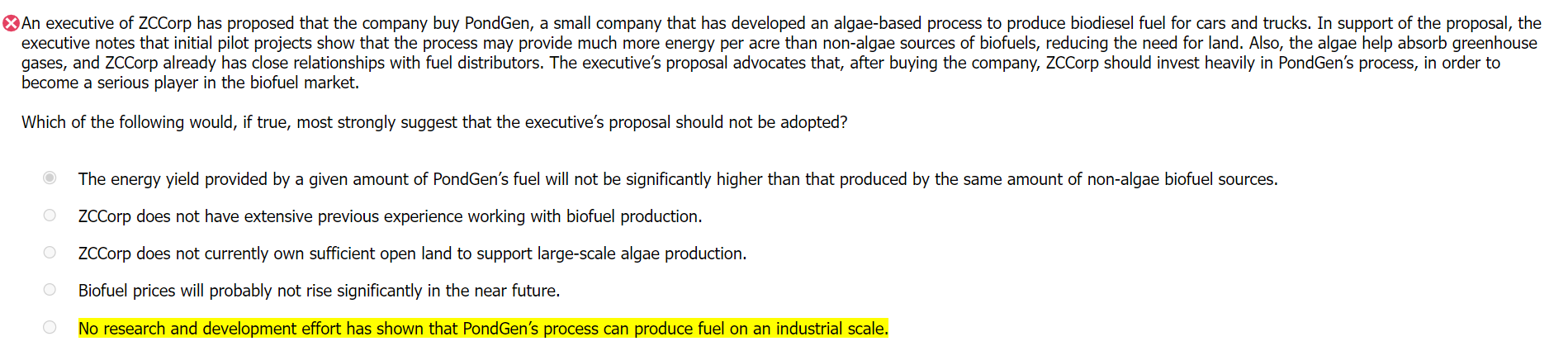 So, if as this choice says, no research and development effort has shown that PondGen’s process can produce fuel on an industrial scale, adopting the proposal could be a big mistake. After all, it could turn out that PondGen's process cannot produce fuel on an industrial scale, in which case the entire investment would be lost.