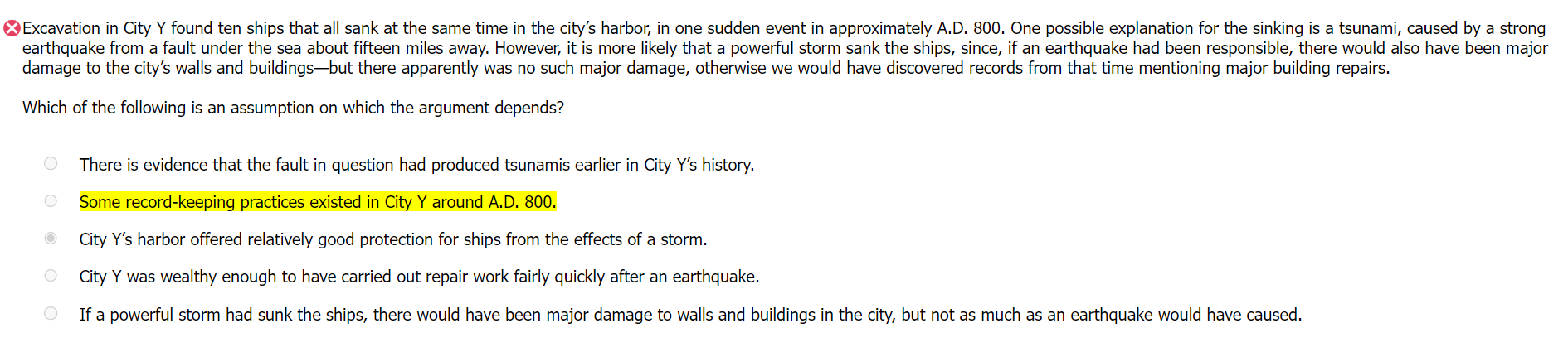 Excavation in City Y found ten ships that all sank at the same time in the city’s harbor, in one sudden event in approximately A.D. 800. One possible explanation for the sinking is a tsunami, caused by a strong earthquake from a fault under the sea about fifteen miles away. However, it is more likely that a powerful storm sank the ships, since, if an earthquake had been responsible, there would also have been major damage to the city’s walls and buildings—but there apparently was no such major damage, otherwise we would have discovered records from that time mentioning major building repairs.The conclusion of the argument is the following: