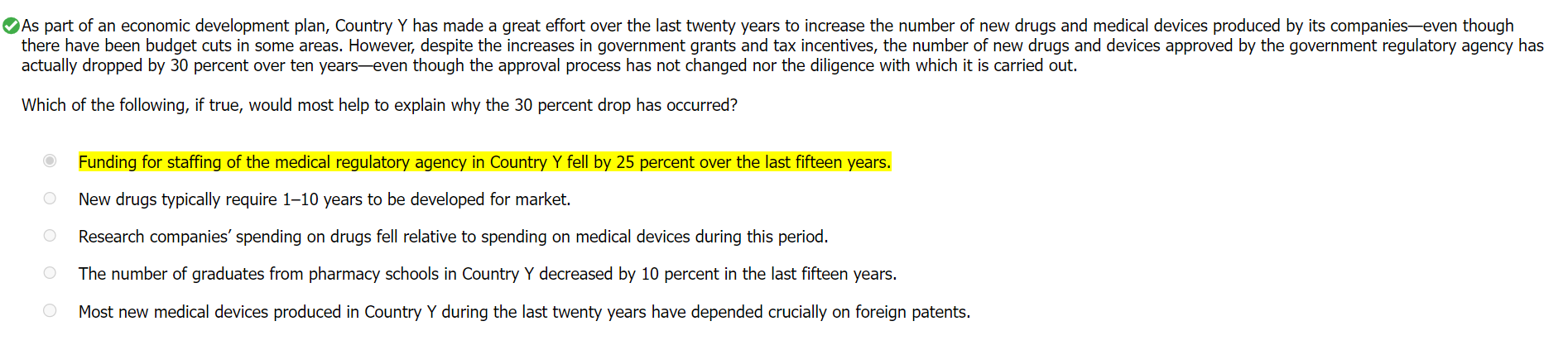 A. Funding for staffing of the medical regulatory agency in Country Y fell by 25 percent over the last fifteen years.Seeing this choice, we get the sense that answering this question is going to involve noticing specific details.