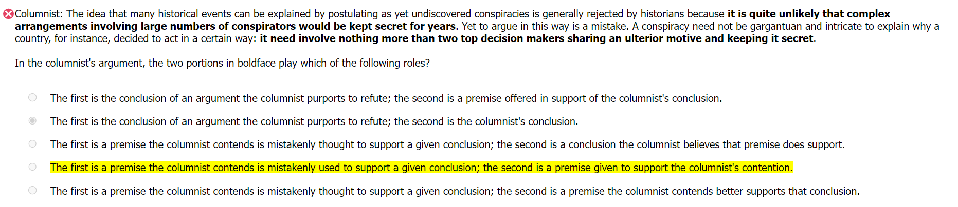 However, the second part of this choice is incorrect because the second boldfaced portion doesn't support historians' conclusion but rather supports the columnist's conclusion that historians are mistaken.
