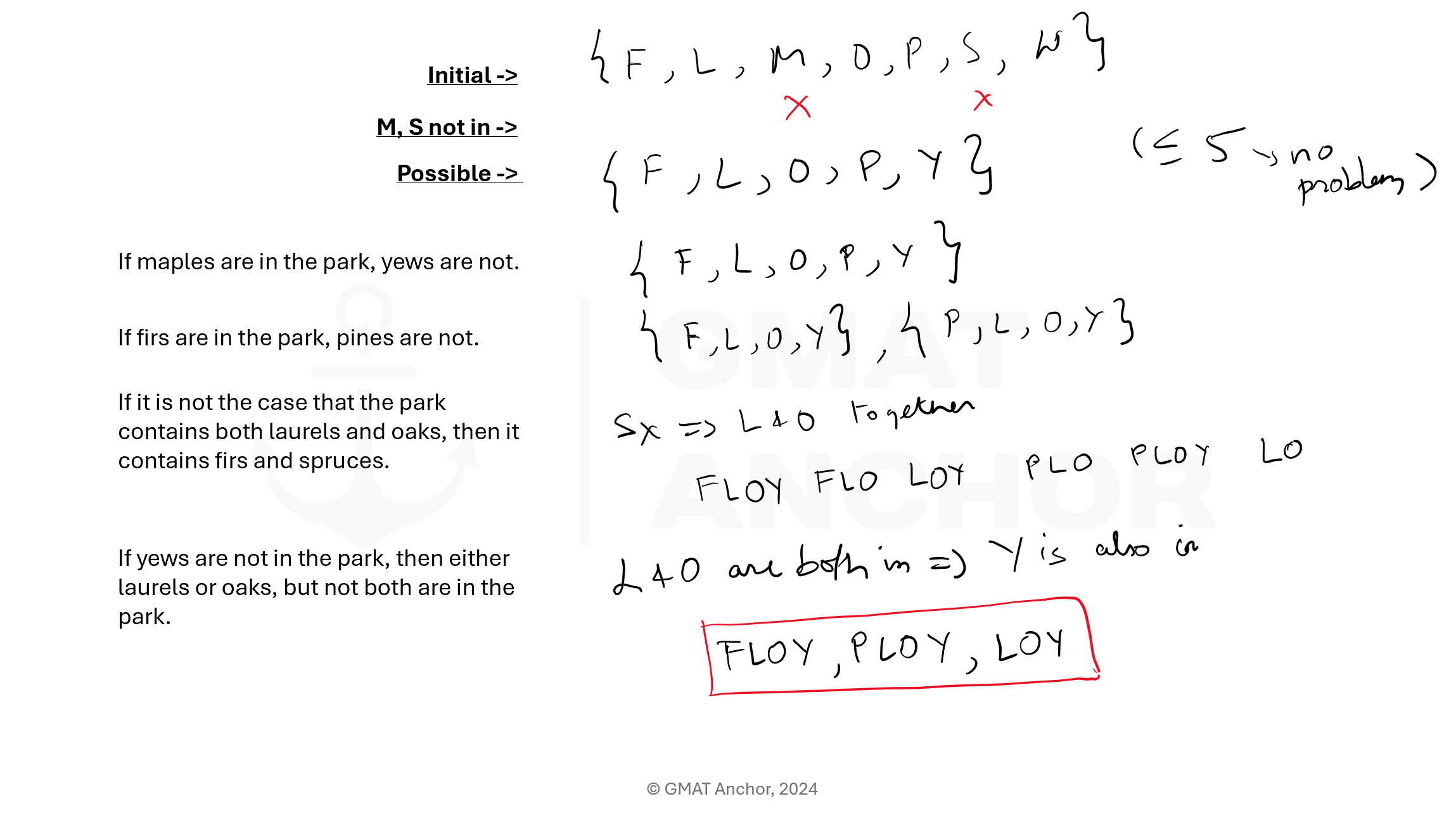 LO, LOY, LOF, LOP, FLOY, PLOY-> If yews are not in the park, then either laurels or oaks, but not both are in the park.If Y is not in, then L and O cannot both be in.