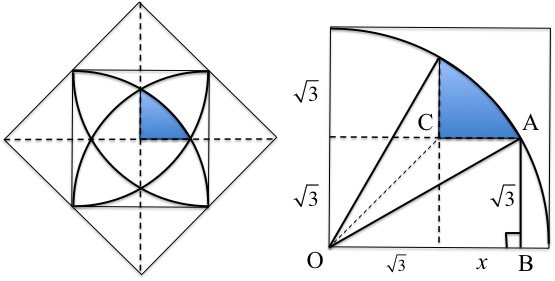Since \(OA=2\sqrt{3}\) is twice \(AB=\sqrt{3}\), triangle \(OAB\) is a 30-60-90 triangle. We can see that the quarter of the circle with radius \(OA\) is divided into three equal sectors with a central angle of 30 degrees. The area of each such sector is\(\frac{\pi(2\sqrt{3})^2}{4\cdot{3}}=\pi\).
