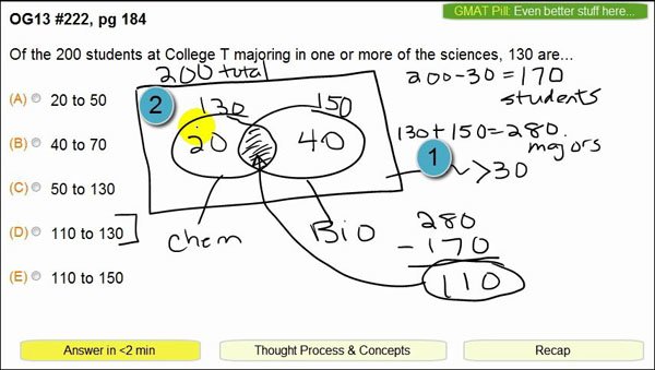 Q: Of the 200 students at College T majoring in one or more of the sciences, 130 are majoring in chemistry and 150 are majoring in biology.... [please purchase OG and follow along on pg184 for remaining question]