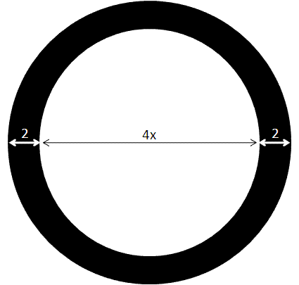 The metal ring extends 2 inches in every direction, so the diameter of the whole table is \(4x + 4\), as in the diagram below: