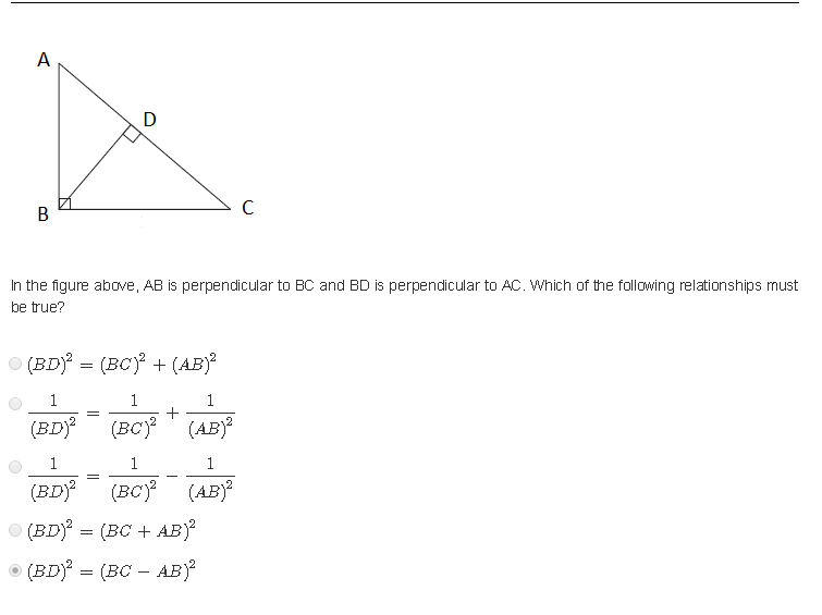 \(\frac{1}{BD^2} = \frac{1}{BC^2}+ \frac{1}{AB^2}\) ...And this now matches one of our answer choices!