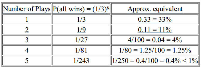 We might also have noticed that only the denominator in the probabilities mattered, as the numerator was always 1. To have a probability of less than 1%, the fractional probability must be “1 over something greater than 100.” In order for 3^n >100, n must be at least 5.