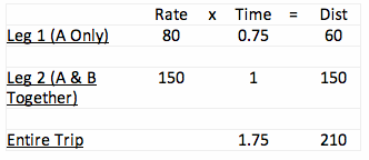 We were given that Train A’s rate is 80mph, and we were given that Train A traveled alone for 45 minutes (0.75 of an hour). Any time you are given two parts of a three-part equation, you can solve for the third part: Train A traveled 60 miles between 7:00 am and 7:45 am.
