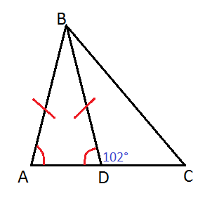 [quote="HarveyKlaus"]In the figure below, if AB=BD and the measure of angle BDC is 102, what is the measure, in degrees, of the angle ABD?