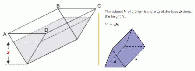 \(\frac{1}{2}\,\, = \,\,\frac{{{V_{{\text{water}}}}}}{{{V_{{\text{tank}}}}}}\,\,\mathop = \limits^{\left( * \right)} \,\,\frac{{{S_{\Delta EFG}} \cdot FH}}{{{S_{\Delta EAD}} \cdot DC}}\,\,\,\mathop = \limits^{FH = DC} \,\,\,\frac{{{S_{\Delta EFG}}}}{{{S_{\Delta EAD}}}}\,\,\,\mathop = \limits^{\left( {**} \right)} \,\,\,{\left( {\frac{x}{6}} \right)^2}\,\,\,\,\, \Rightarrow \,\,\,\,\,\frac{x}{6} = \frac{{\sqrt 2 }}{2}\)