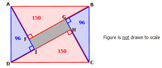 Rectangle ABCD is comprised of 4 right triangles and rectangle FGHI. Triangles ADI and CBG are identical, and each has an area of 96. Triangles AFB and CHD are identical, and each has an area of 150. If the sides of each triangle have integer lengths, what is the area of rectangle FGHI?
