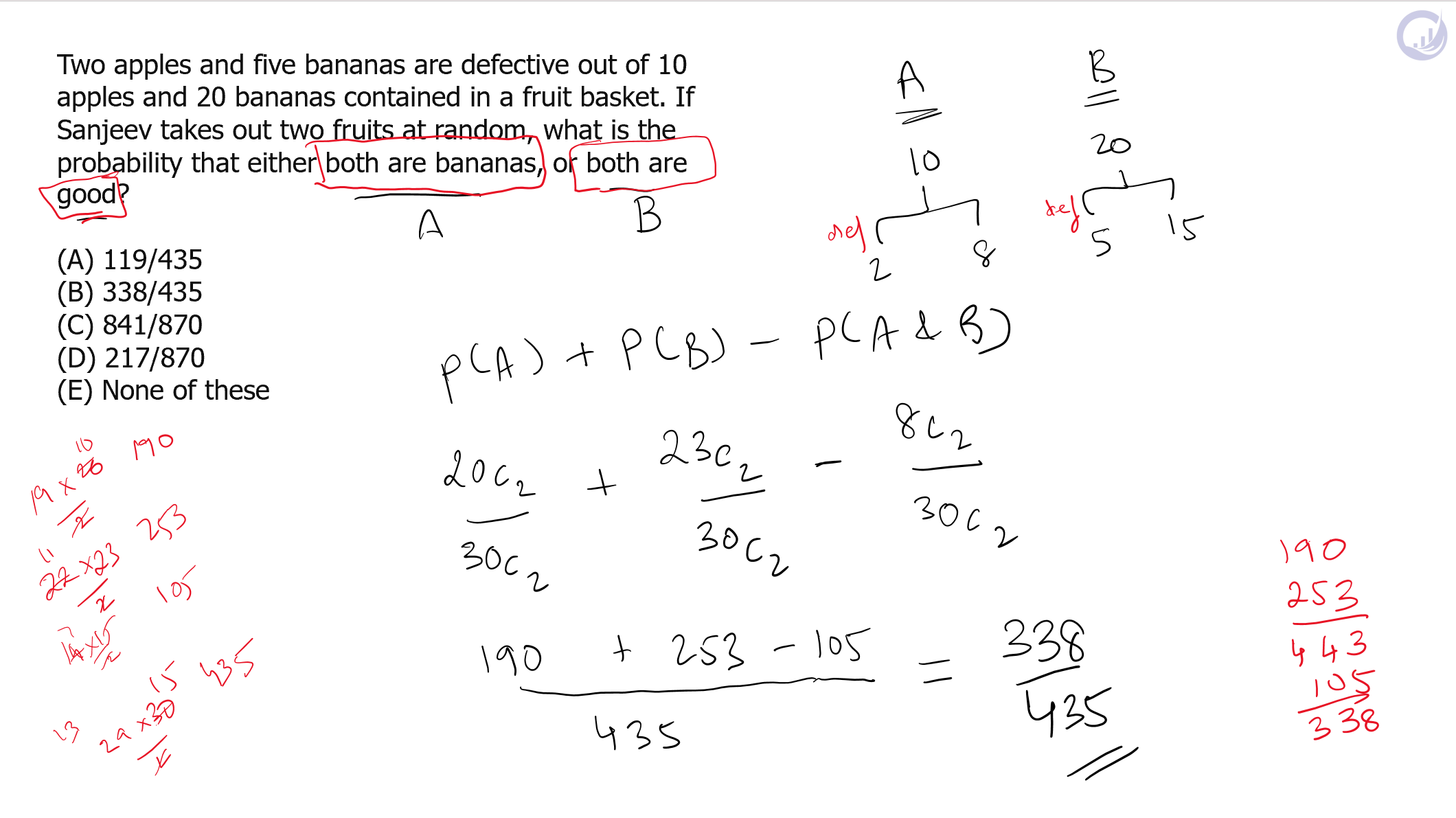Notice that 2 good bananas are included in the calculations twice, hence you need to remove/subtract that probability from the total.P(both are good bananas is repeated twice) {Therefore we need to subtract 2 good bananas from the total so far which is 506/870 + 380/870 = 886/870}There are 15 good bananas, so selecting 2 each out of this is 15C2/30C2