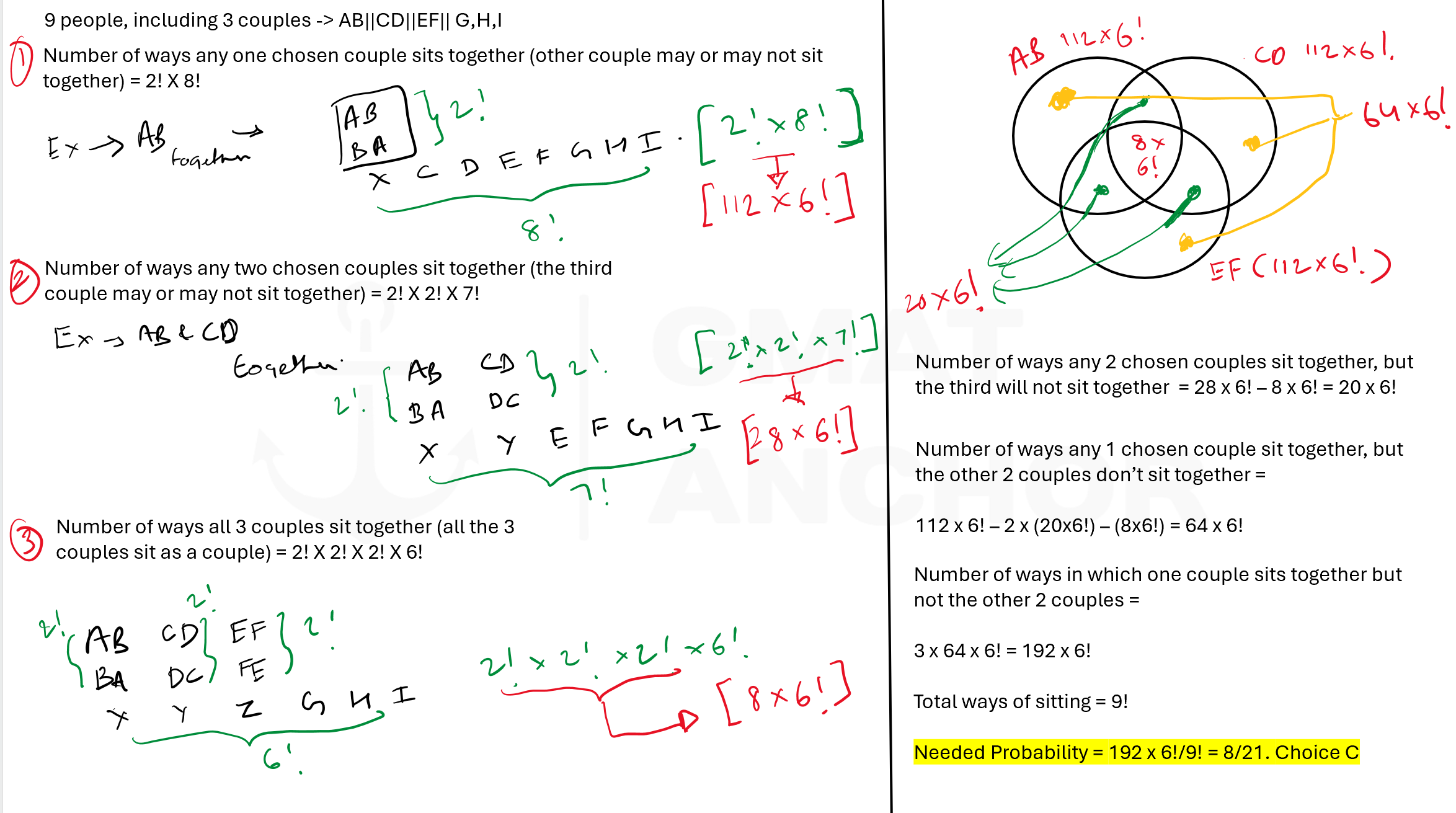 So only couple A sits together in 8! * 2 - (20*6!) - (6! * 8) - (20 * 6!) = 64 * 6! (only the region that is yellow)