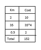 (Remaining distance multiplied by 2 as the rate after the first 2 kilometers is given per 500 meters)= 10 + (35.5*4)