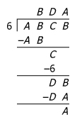 Focusing solely on the top part (ie. \(\frac{ABCB}{6} = BDA\) with a remainder of \(A\)):