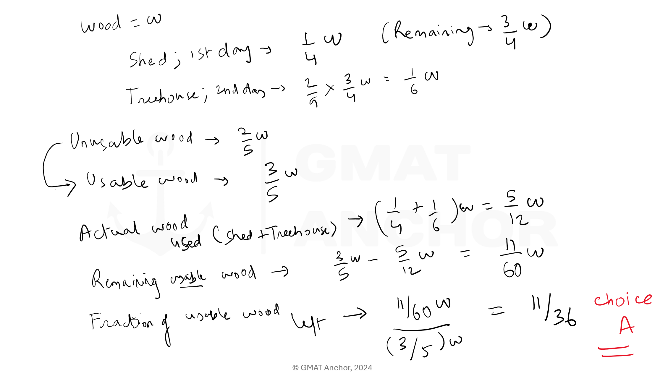 Finally, fraction of usable wood left = 11/60 * 5/3 = 11/36