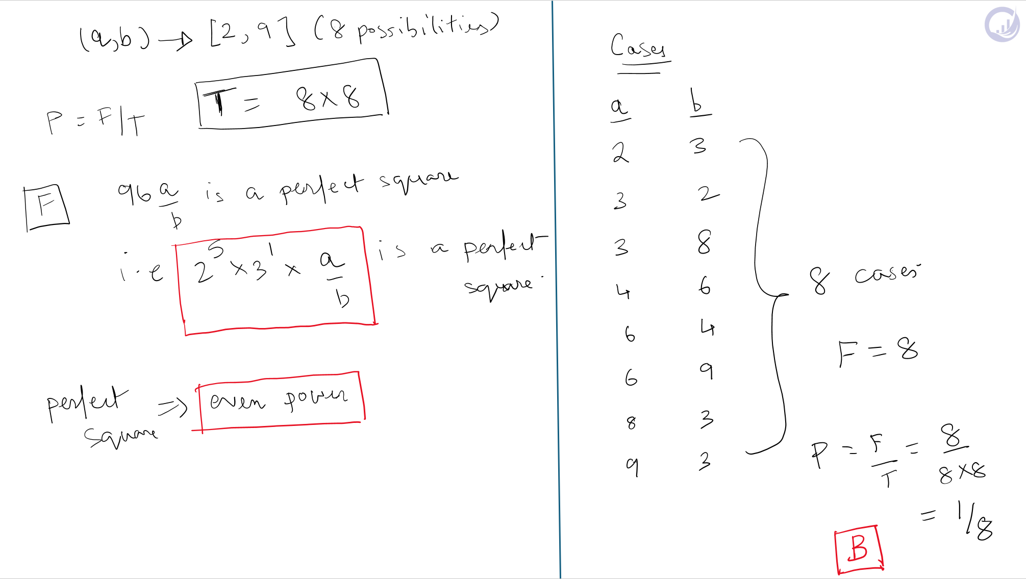 a and b are chosen independently from {2,3,4,5,6,7,8,9}, so total outcomes = 8 x 8 = 64. Note: order matters — (3,2) and (2,3) are different draws, and a = b is allowed.