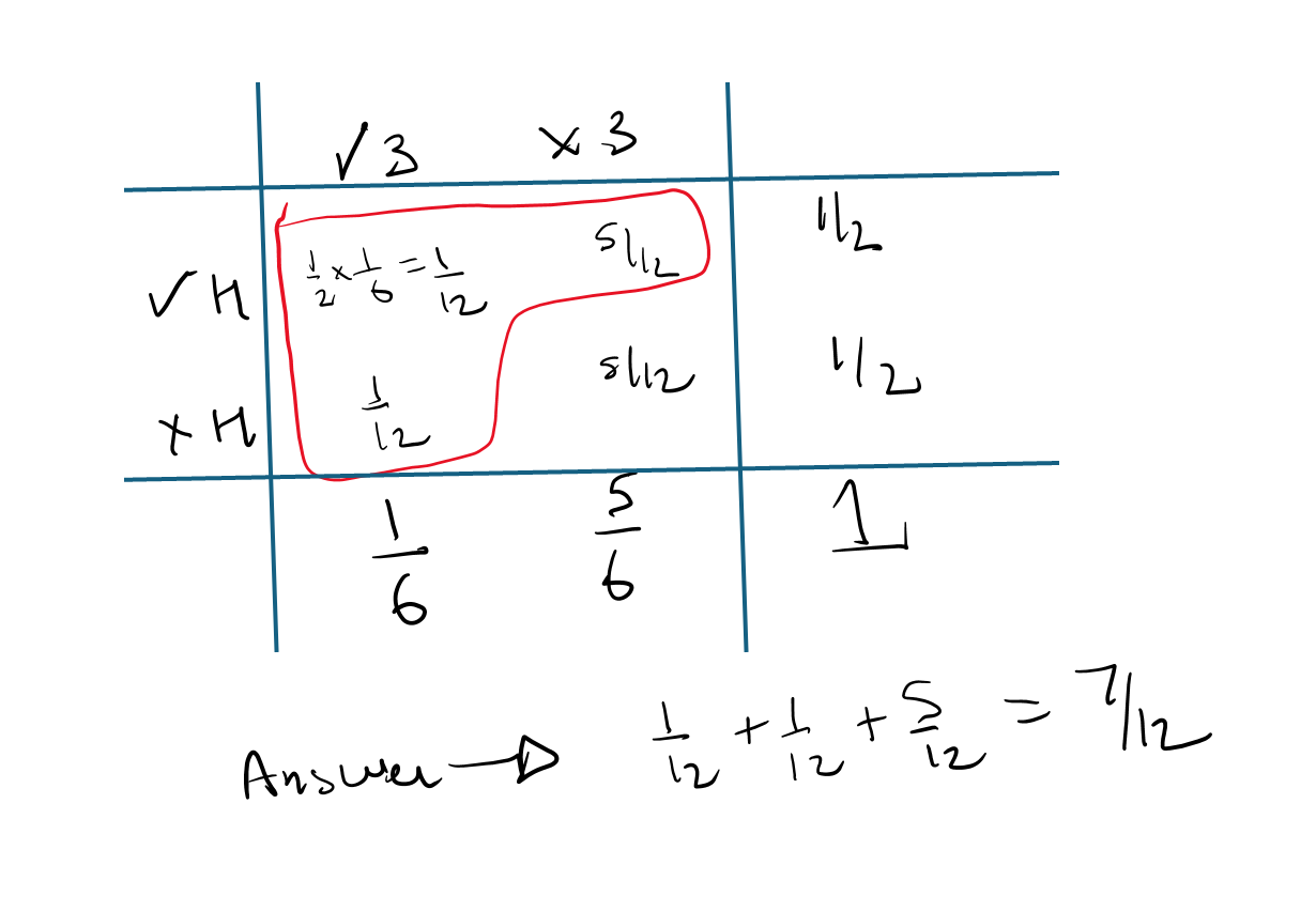 and the coin lands on heads, hence we should subtract P(3 on the die and heads on the coin)=1/6*1/2 once, to avoid double counting.