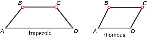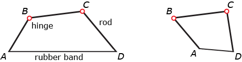 A good way to visualize the constraints is to use “rubber-band geometry.” Picture the three sides that we do know as stiff rods, each of length 10. They are hooked together with flexible hinges, because we know nothing about the angles in the polygon. Finally, the fourth side (AD) is a rubber band – it can stretch and shrink as we flex the hinged rods.
