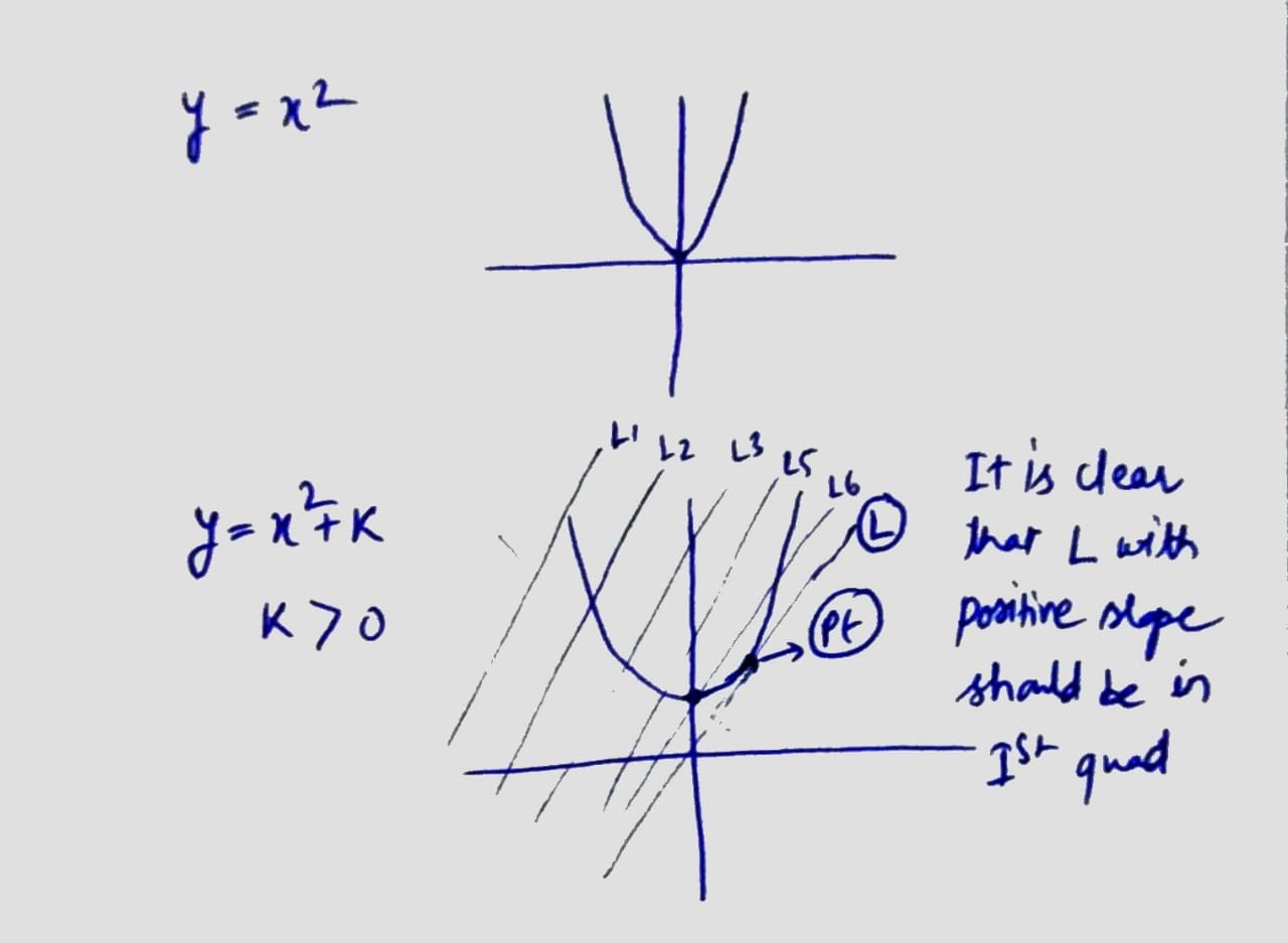 Given: A parabola in the coordinate geometry plane is represented by the equation y = x^2 + k, where k is a constant greater than 0. Line L intersects this parabola at exactly one point. Target question: Is the point of intersection in Quadrant I?First off, here's what the graph of y = x² looks like: