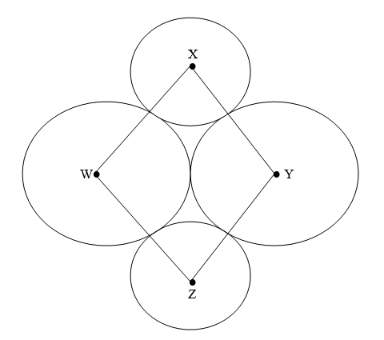 The sum of radii of W and Y is equal to sum of the radii of X and Z. W and Y are identical, X and Z are identical. All the 4 circles are identical.