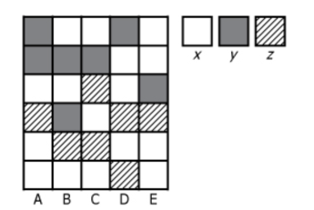 The figure above shows an array of 30 square tiles, each of which is solid white, solid gray, or diagonally hatched. Each solid white tile is priced at $x, each solid gray tile is priced at $y, and each diagonally hatched tile is priced at $z. If the total price of the 12 tiles in Columns B and D is $39, what is the total price of all 30 tiles in the array?There are a total of 16 white, 7 gray, and 7 diagonally hatched tiles in the square. Hence, the question asks to find the value of 16x + 7y + 7z, while we are given that 6x + 3y + 3z = $39 (the total price of the 12 tiles in Columns B and D is $39).
