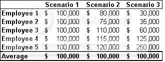 Your CEO has just sent out an email to everyone in your company proud to announce that everyone will be getting an average salary of $100,000 next year. You should be excited, right? No, you are smarter than the average folk and decide to dig deeper into the numbers. :wink: Let's look at a couple of scenarios and see what you think (looking at a sample of 5 people):