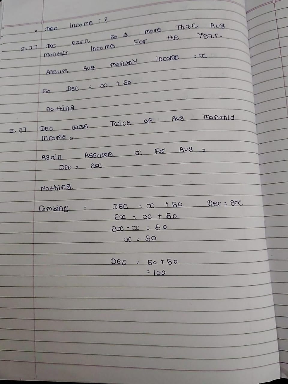 (1)+(2) We have two distinct linear equations with two variables, \(December \ income = Average \ income + $50\) and \(December \ income=2*Average \ income\), hence we can solve it. Sufficient.