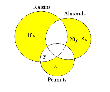 I would really appreciate your help. When I read this: "The number of bags that contain only almonds is 20 times the number of bags that contain only raisins and peanuts. ". I thought that the number of bags that only contain almonds is equal to the number of bags that contain raisins and the number of bags that only contain peanuts. So I said A=20*(10x+x)=20*(11x). Rather than what you had which is the 20y, where y is the number of bags that are a mixtures of both raisins and peanuts.