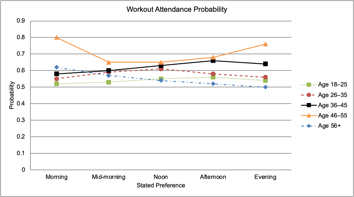 For example, for members aged 46–55 who preferred Morning, the probability of attending a workout at that time was 0.80.