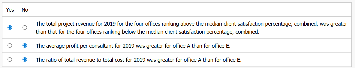 | The average profit per consultant for 2019 was greater for office A than for office E. | ||
