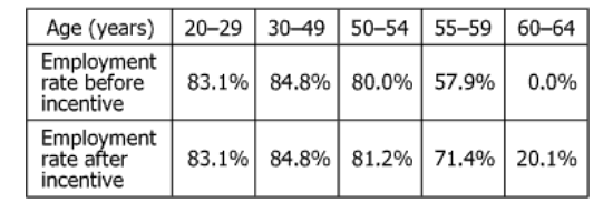 | The incentive scheme has the greatest effect on the employment rates of those workers who are within 5 years of the retirement age. | ||